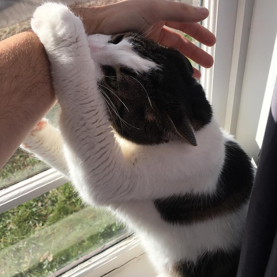 The idiot weighs 18.5 pounds, as of his last vet visit. This thickness escapes his consideration as he traverses lap to lap, crotch to crotch, sticking his short-lipped, hatchet-faced beak into the mouths of the humans who are only telling him to fuck the fuck off and let them eat in peace. He will sleep upon the chests and faces of any who choose to slumber in accessible areas, and he will do it with the smuggest, most hedonistic fuck-you look on his terrible face.